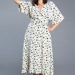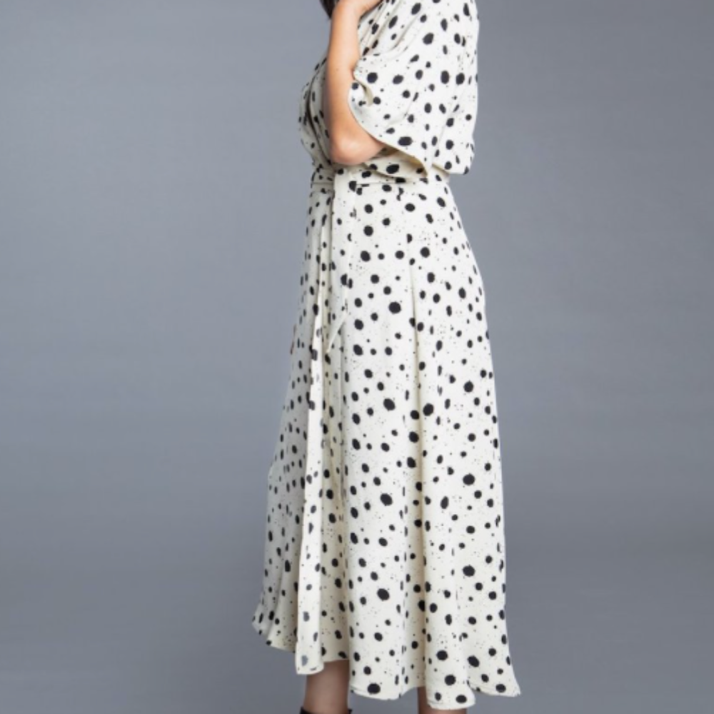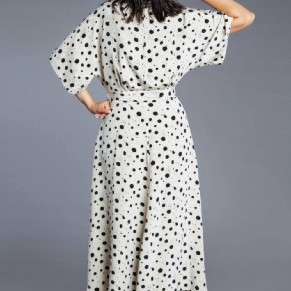 Elodie features a softly flowing bodice, with release pleats under the bust and a dolman style sleeve. Choose between a short sleeve or a longer, more formal option that ends at the elbow. The skirt is swishy and voluminous and comes in three lengths, above the knee, midi or maxi, with optional patch pockets.