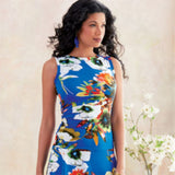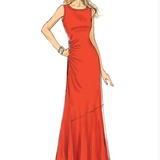 Dress is close fitting with side gathers, neck and armhole bands and slightly flared hem in three lengths.