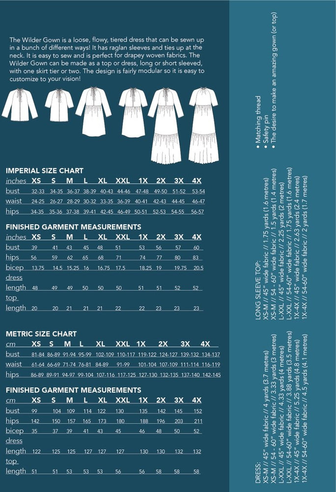 The Wilder Gown is a loose, flowy, tiered dress that can be sewn up in a bunch of different ways! It has raglan sleeves and ties up at the neck. It is easy to sew and is perfect for drapey woven fabrics. The Wilder Gown can be made as a top or dress, long or short sleeved, with one skirt tier or two. The design is fairly modular so it is easy to customize to your vision!
