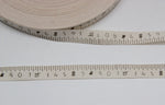 A smooth woven cotton ribbon with printed tape measure design intersected with haberdashery-themed objects, and cream background. Suitable for crafts, bunting trim, embellishment... 17mm wide.