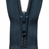 A mediumweight nylon coil zipper with nylon fabric tape. Open-ended with plastic stopper and meta pull, suitable for jackets, coats, knitwear, children's clothes and accessories.