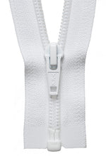 A mediumweight nylon coil zipper with nylon fabric tape. Open-ended with plastic stopper and meta pull, suitable for jackets, coats, knitwear, children's clothes and accessories.