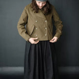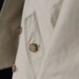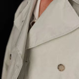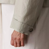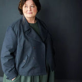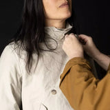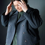 Inspired by a vintage Austrian hiking jacket. This neat mid-season piece is perfect for all weathers. A double breasted jacket that can be lined or unlined. It features two flap pockets and a button tab to close the collar.