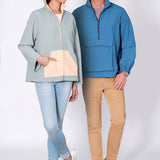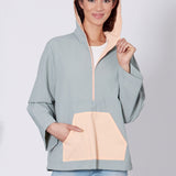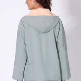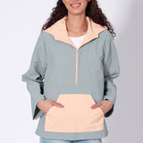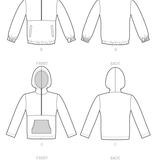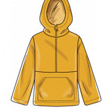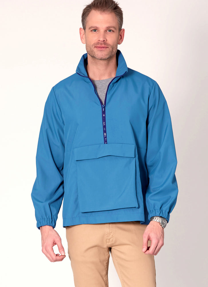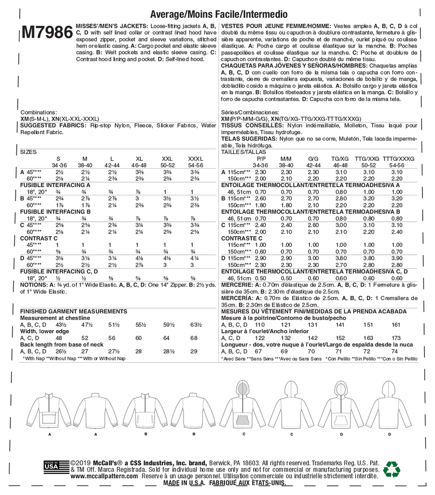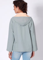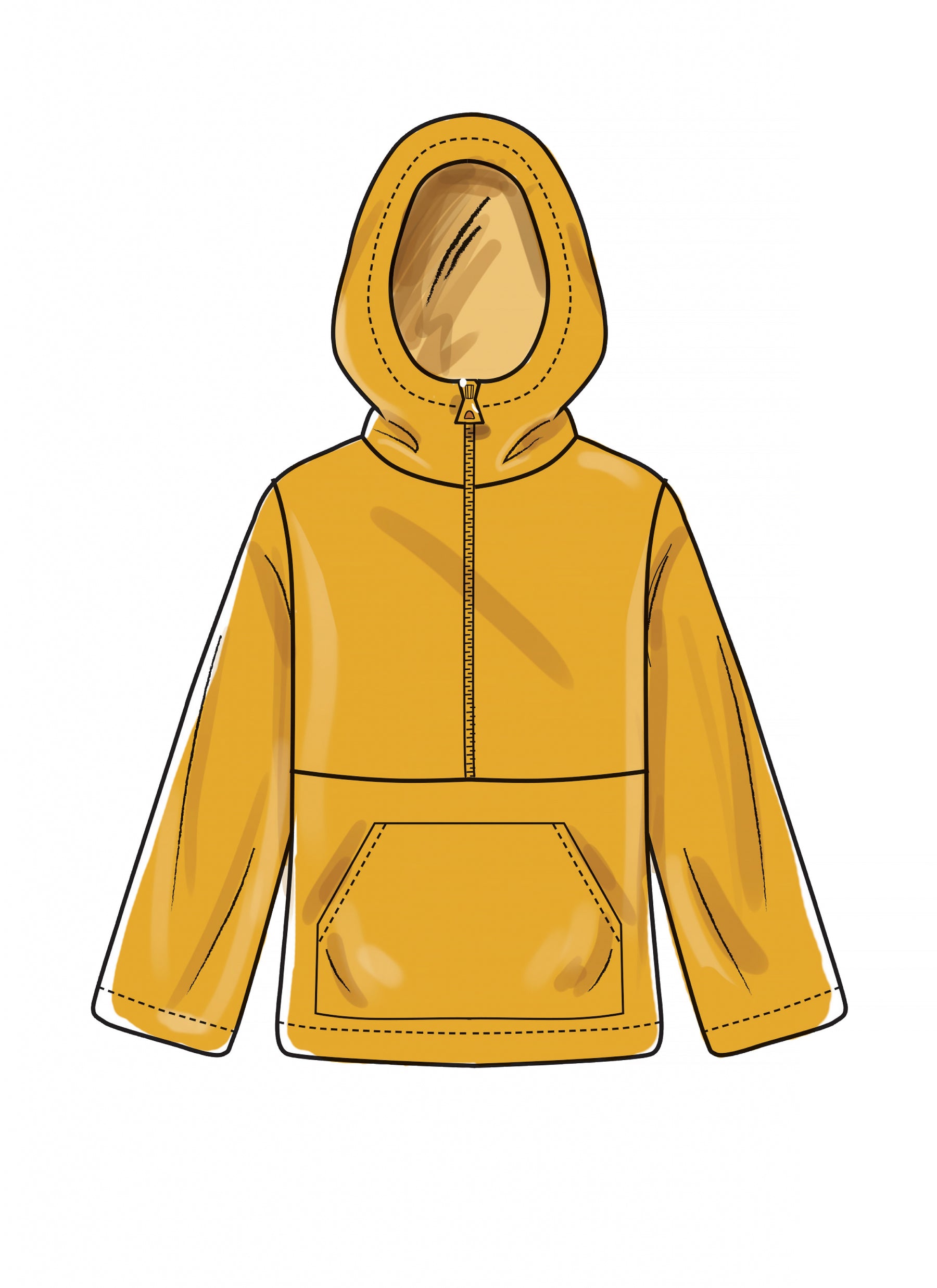 A B, C, D Loose fitting jackets with self lined collar or contrast lined hood have exposed zipper, pocket and sleeve variations, stitched hem or elastic casing. A: Cargo pocket and elastic sleeve casing. B: Welt pockets and elastic sleeve casing. C: Contrast hood lining and pocket. D: Self lined hood.