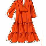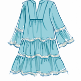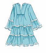 Misses’ loose-fitting dress with tiered flounces. Sleeveless, sleeve length and trim variations. Sew Rating Easy.