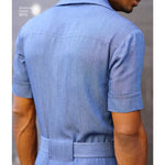 Mimi G’s take on this Simplicity Men’s Vintage 1970’s jumpsuit and overall. The top-stitched jumpsuit v.A with fly front zipper closing, has notched collar, back yoke, chest patch pockets, lower pockets that form carriers, back carrier, self fabric buckled belt and short set-in sleeves with tuck detail. The top-stitched overalls v.B with fly front zipper have side button closing, suspender crossed in back and fastened to bib with “hook-up closures.” patch pocket buttoned to bib, front and back trousers patch pockets and a back tool pocket.