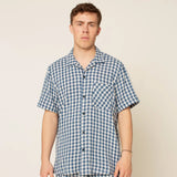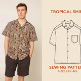 The Tropical Shirt sewing pattern is a casual button up short sleeved shirt with a convertible collar. The shirt has side slits, a double yoke, and two back pleats. The left front has a pocket.