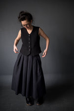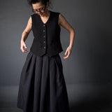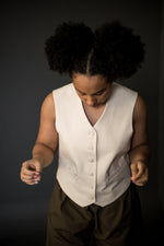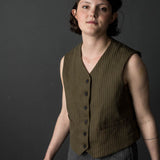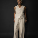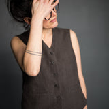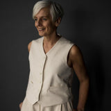 A softly structured waistcoat with a boxy fit, two welt pockets and a simple stitched belt at the back. Layer up in the winter or wear on its own in the summer in a tumbled linen.