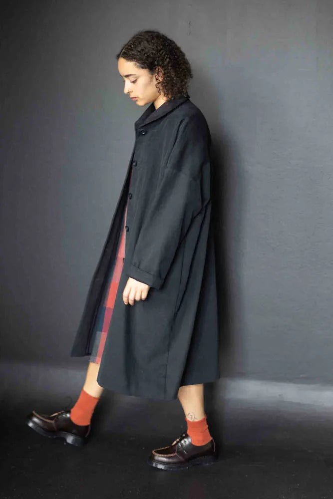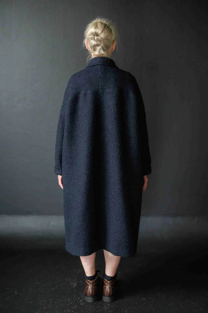 An oversized coat or jacket with a rolled collar and turn back cuffs. Coat has inseam pockets and jacket has patch pockets. Choose to make either lined or unlined.