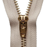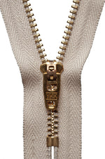 Strong gold-coloured brass metal tooth YKK zip with woven polyester tape, auto-lock slider and heavy metal teeth. Closed-ended, suitable for dressmaking (trousers, jeans flies, visible dress, blouse and skirt zips) and accessories (purses, bags, cushions). Choose from five lengths and four classic colours.