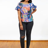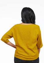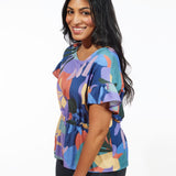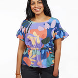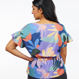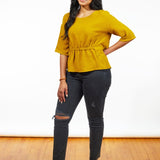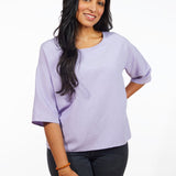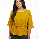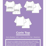 The Corin is a drapey drop shoulder top with a wide round neckline. The pattern includes two sleeve options – a ruffled cap sleeve and a straight 3/4 length sleeve. An optional gathered elastic detail at the front and back waist adds interest and shaping. While we have have sewn up three views of the pattern, the sleeves and elastic can be combined in any configuration to create 6 different options.
