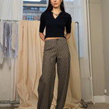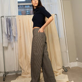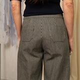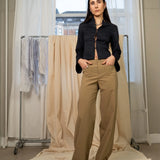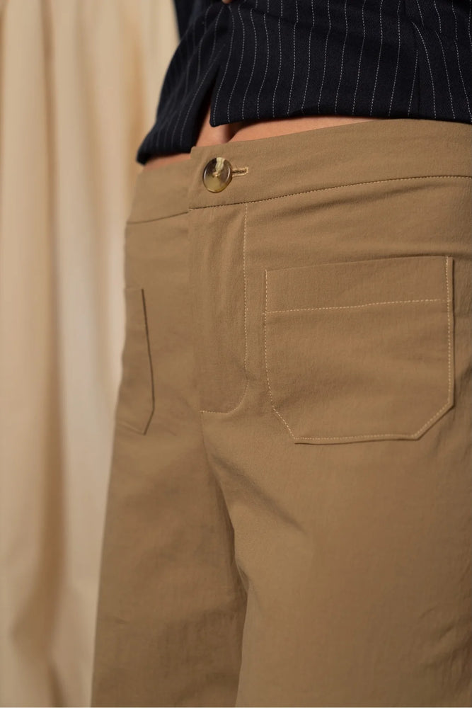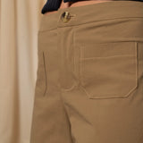 The PEACHY Pants feature a mid-rise design with wide, slightly curved pant legs. The pants have a fly with an underlap, secured by a zipper and a button closure. They include a waistband, darts at the back, and patch pockets that can be placed on the front and/or on the back.