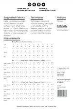 Fabric Recommendations: Light to medium weight woven fabrics such as cotton, linen, chambray, rayon, etc. Extra fabric may be needed to match plaids, stripes, or one-way print designs.