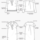 The Augusta is a cocoon shaped dress or shirt with an asymmetrical collar and mitered split hem. Choose from a short cuffed sleeve or a long straight sleeve; both are interchangeable with the dress or shirt.