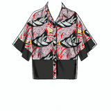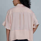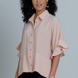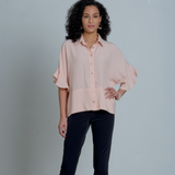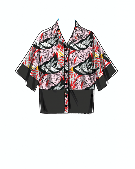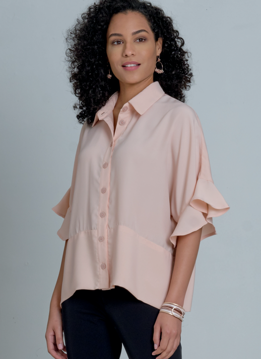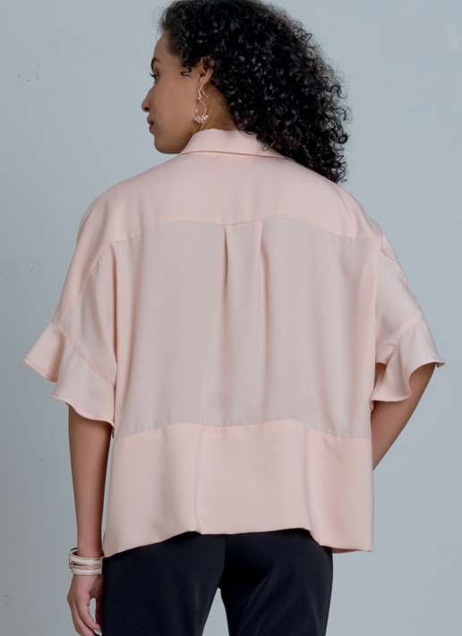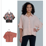 Very loose-fitting tops have button front closure with front band, double back yoke, pleat at back, collar with collar band, sleeve variations and hem band.