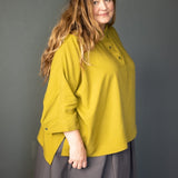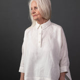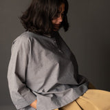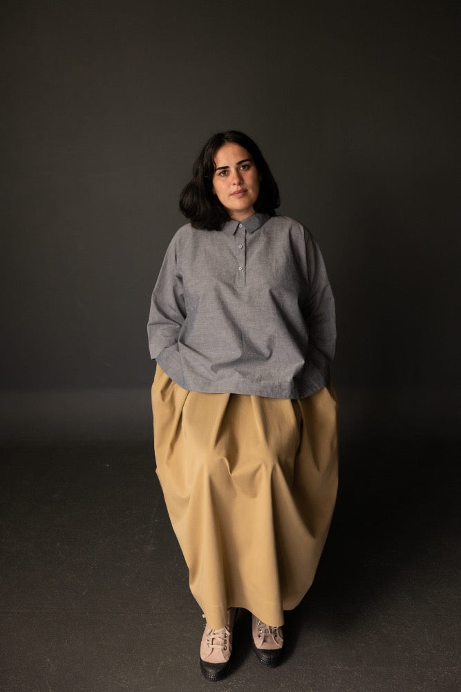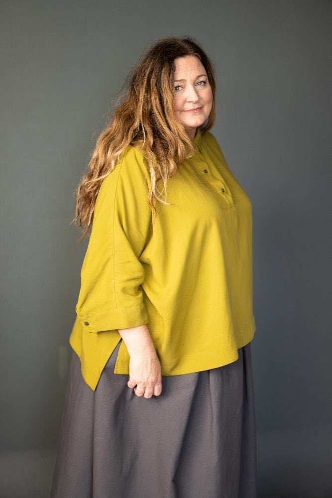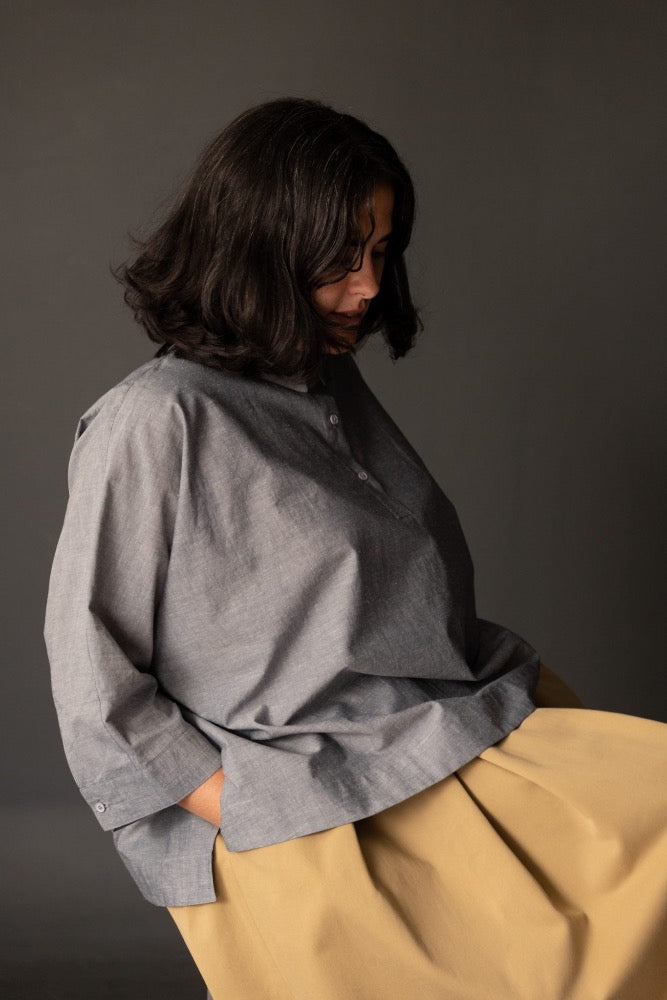 An oversized, boxy shirt with a dropped back hem and half placket. Swingy and absurdly comfortable.