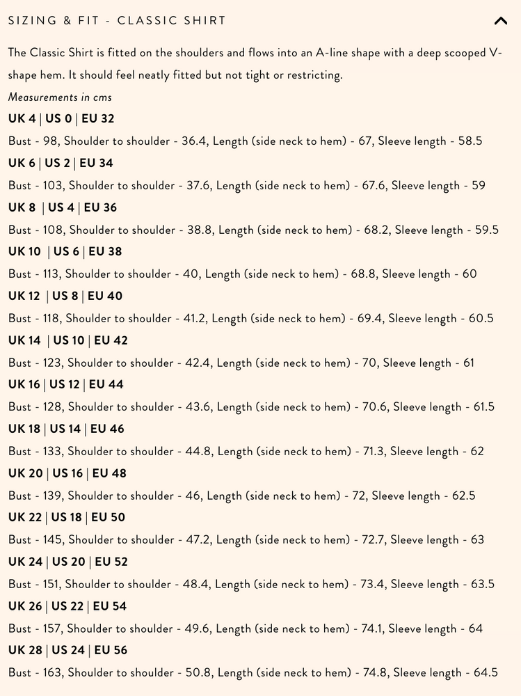 A timeless wardrobe staple, the Classic Shirt features traditional shirt making techniques with a chic, modern cut. It's our second best selling pattern (after the Worker Trousers) for its understated elegance and easy-to-wear feel.