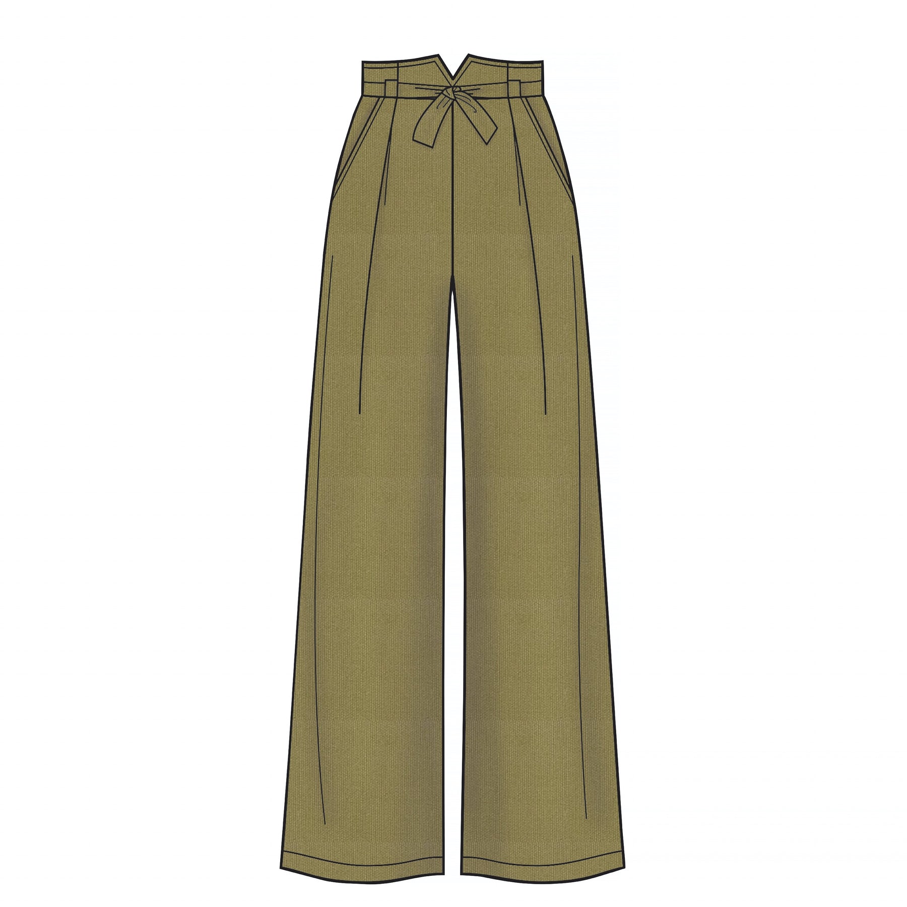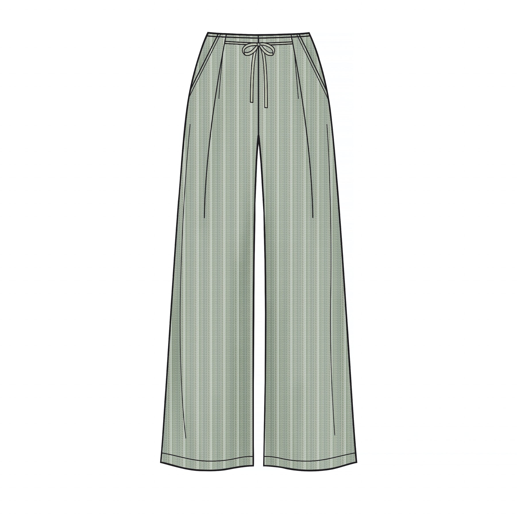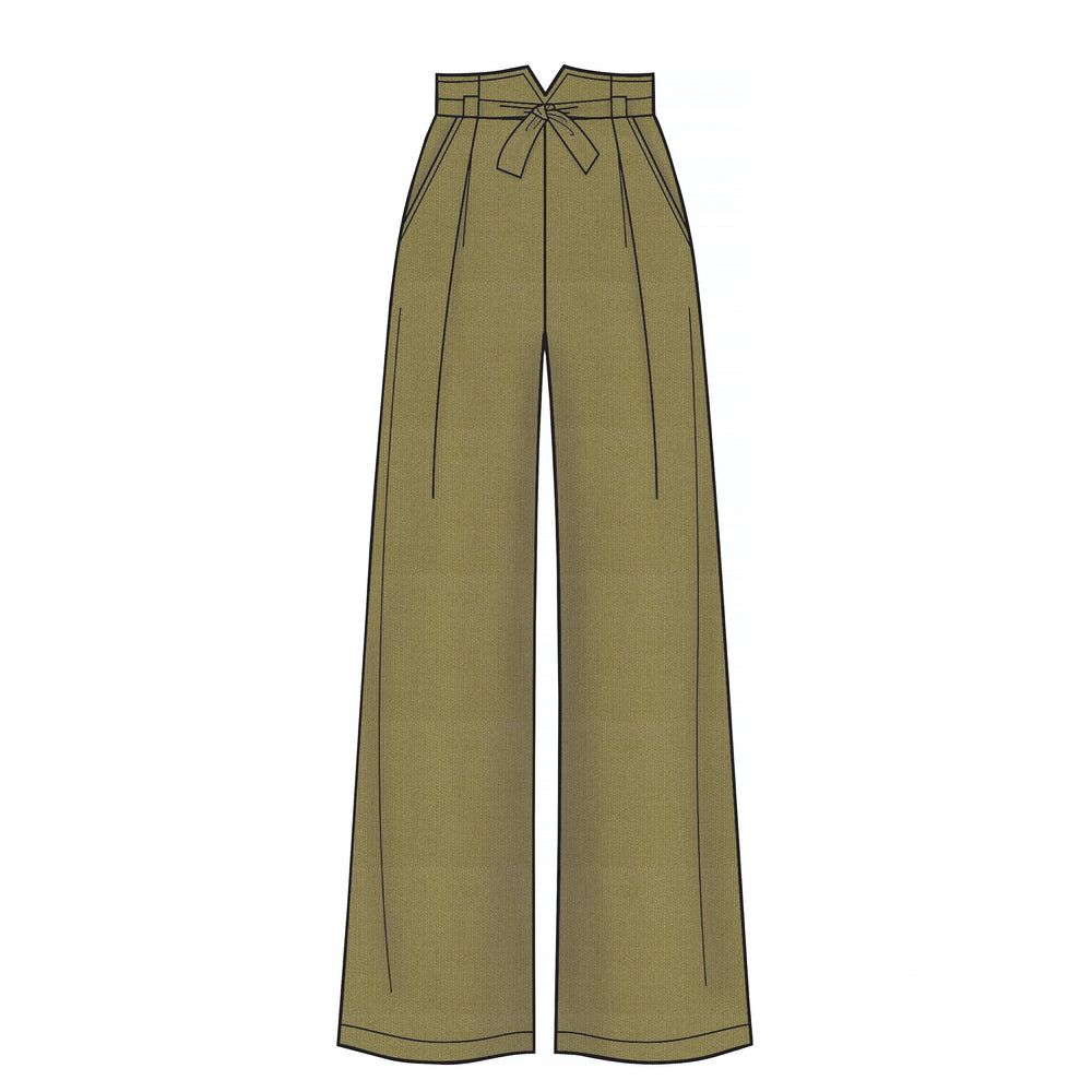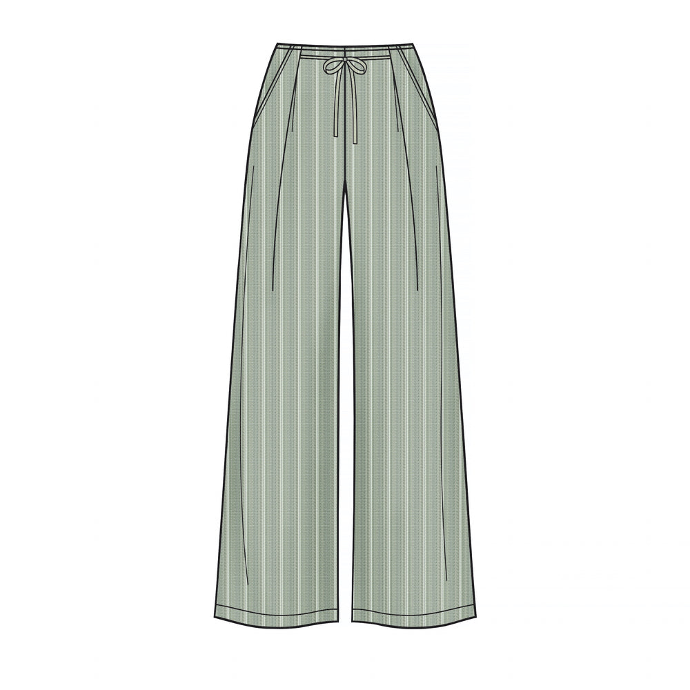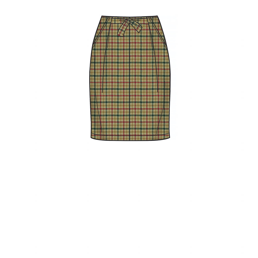Straight-leg trousers with side pockets, pleats, waistband tie and length options. Slim skirt in two lengths. Both trousers and skirts fasten at centre back. Suitable for woven fabrics.