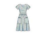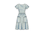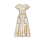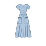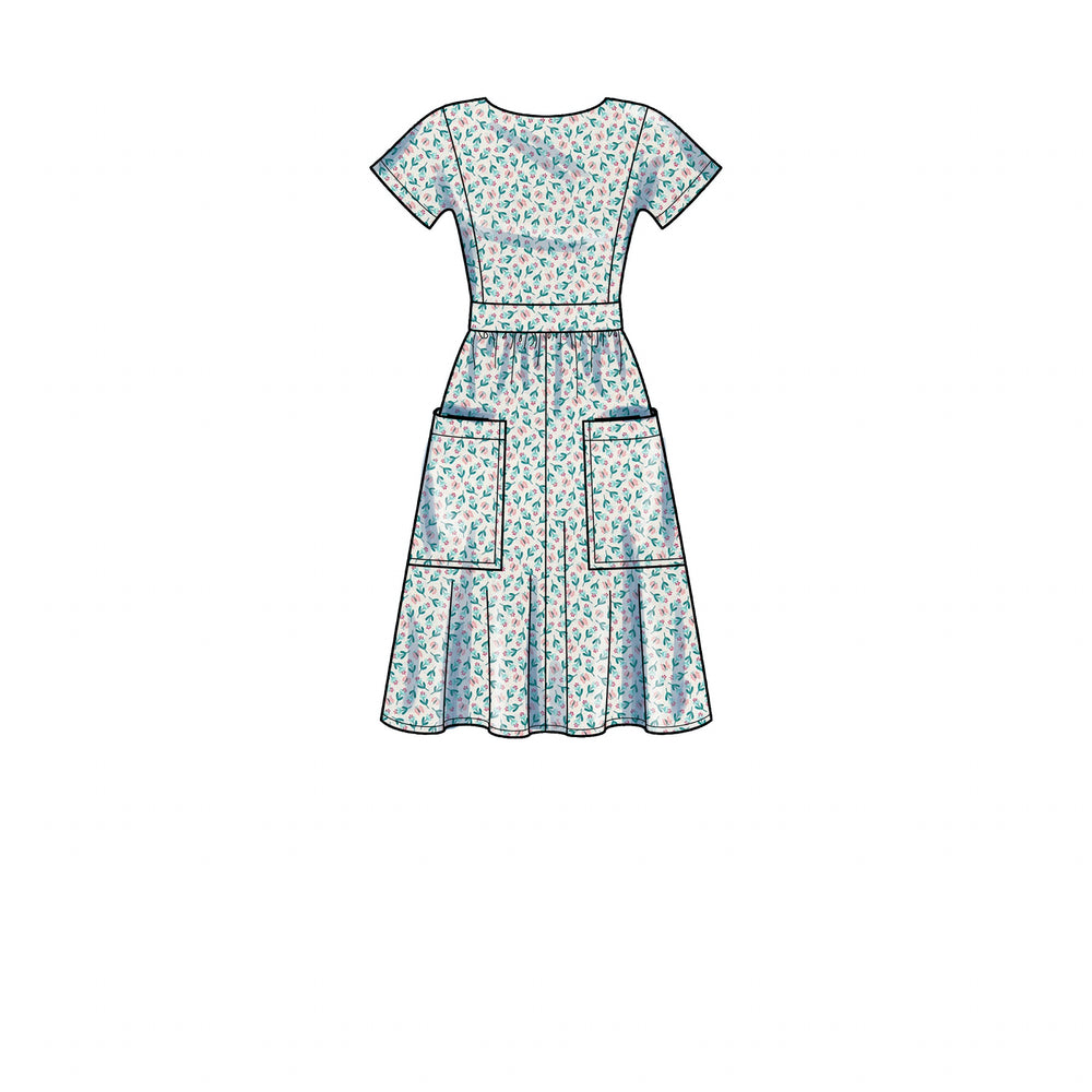 Dress in two lengths with patch pockets, back options either cross-over bodice or centre back button variations.