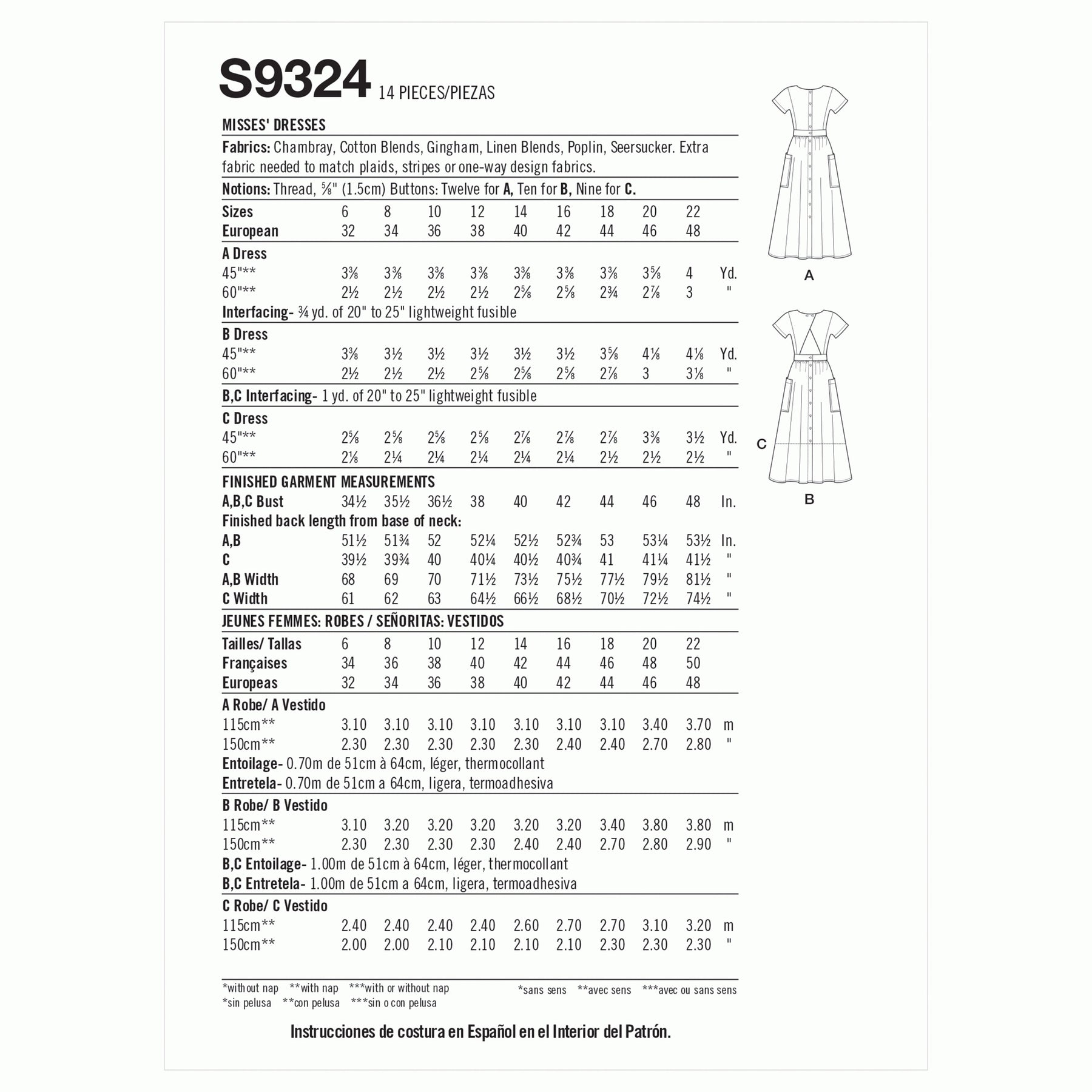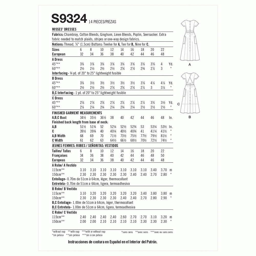 Suggested Fabrics: Soft Cotton, Chambray, Cotton Blends, Double Georgette, Linen/Linen Blends, Fine Needlecord, Seersucker, Gingham. (Extra fabric needed to match checks, stripes or one-way prints).