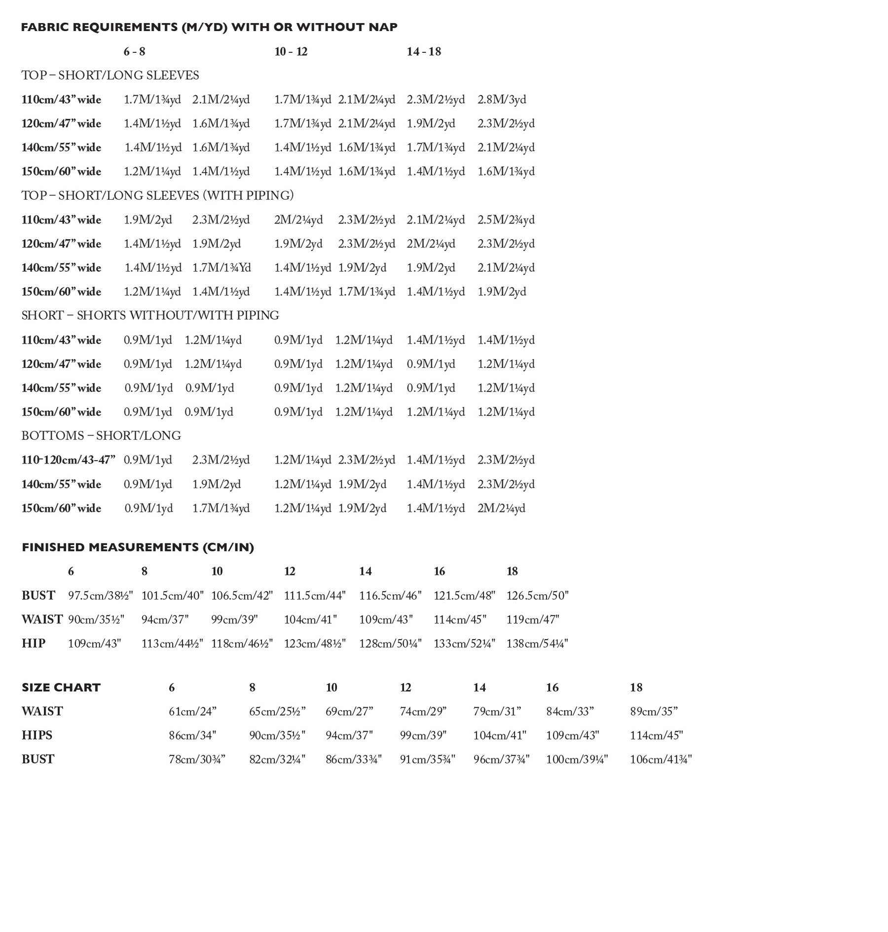 Notions: 1 x Matching thread. 4 x 10mm buttons (top). 0.65M of lightweight interfacing (top). 5cm of lightweight interfacing (all bottoms). 30 – 45cm x 2.5cm elastic (all bottoms). 3 – 3.5M x 00 size piping (top – optional). 1.6 – 2M x 00 size piping (short shorts – optional)