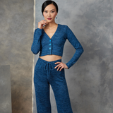 Slim fit V-neck cardigan with button front, and neckline facings. Loose-fitting asymmetric tunic has long sleeves, uneven hemline, and stitched hems. Wide leg pull-on trousers have elasticated waist with drawstring, self tie, and stitched hems.