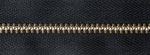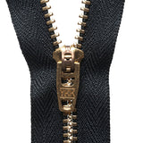 Strong gold-coloured brass metal tooth YKK zip with woven polyester tape, auto-lock slider and heavy metal teeth. Closed-ended, suitable for dressmaking (trousers, jeans flies, visible dress, blouse and skirt zips) and accessories (purses, bags, cushions). Choose from five lengths and four classic colours.