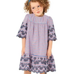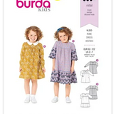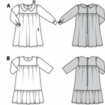 Two sweet dresses with a yoke and gathered skirt. View A is classic with a peter pan collar and cuffed sleeves. Dress view B features a round neckline and 3/4-sleeves. Lengthwise and crosswise stripes are the focus of attention.