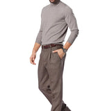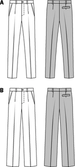 Two variants of men’s pants, with differently wide legs. Both versions with transverse pockets, one waistband pleat and one seat pocket. Pants A with legs tapering towards the hem. B with full, straight legs. Recommended fabrics: Lightweight wool, gabardine, blended linen.