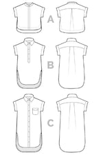 View A is cropped with a wide faced hem, View B is a tunic length shirt inspired by classic men's oxfords, and View C is a stylish shirtdress with a high-low hem. All versions feature a subtly curved yoke, kimono sleeves with arm cuffs, and a dramatically shaped hem. Personalise your Kalle with a standard or band collar, an optional breast pocket, an inverted or box pleat, and button, popover or hidden placket. You can also purchase directly from Closet Core a long sleeve expansion pattern.