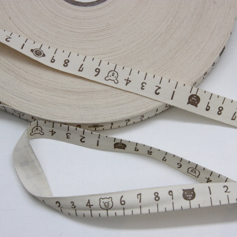 A smooth woven cotton ribbon with printed quirky tape measure interspersed with pig faces on a cream background. Suitable for cutting up to make labels for garments and quilts but can be kept as a ribbon for use in crafts, as bunting trim, embellishment... 16mm wide.