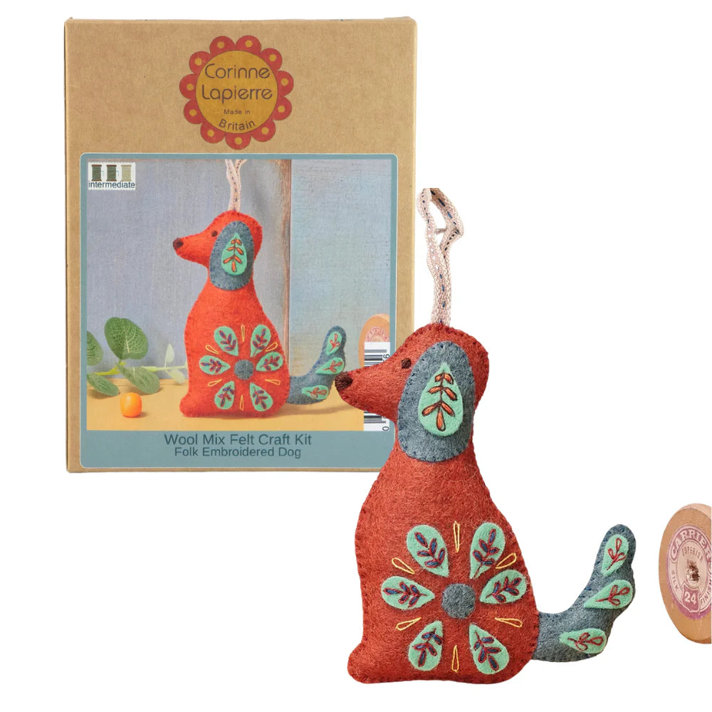 Everything needed to make one delicately embroidered folk dog decoration is in the box (except scissors!).