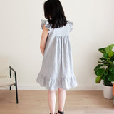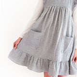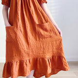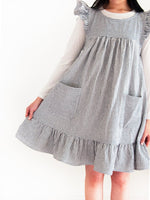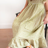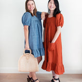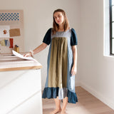 The Champagne Field Dress is a prairie style dress with patch pockets and optional patchwork view with inseam pockets. The front and back bodice include soft gathers that sit above the bust. View A is a mini dress, hitting above the knee and includes a flutter sleeve. View B is a midi dress, hitting mid calf with a high-low hem and gathered puff sleeves finished with a wide elastic cuff. Both views include a large bottom ruffle. View C is a babydoll style top which include soft gathers that sit above the bust and has a flowing bell sleeve. The length is semi cropped that hits right below the natural waist. This Pattern includes a bonus sleeve view which is a modern style ruffle that is easy to construct and interchangeable between views.