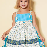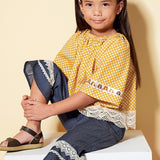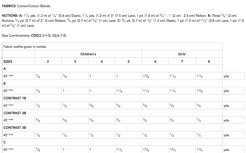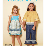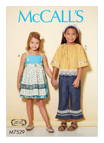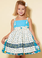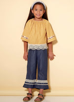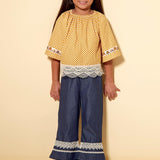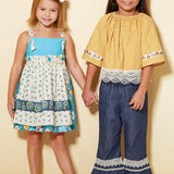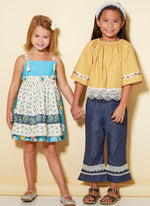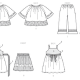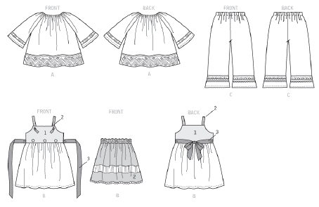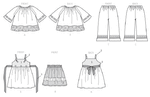 A pattern for toddler and young girls featuring a top, trousers, pinafore dress and detachable apron. The 'peasant' top has an elasticated neckline, wide sleeves and loose fit making is very comfortable. The are bell-bottomed with an elasticated waist. The pinafore dress ties in the back and there is an apron for the front that detaches with buttons. Each garment can be played with in terms of trims, ruffles and cute prints.