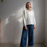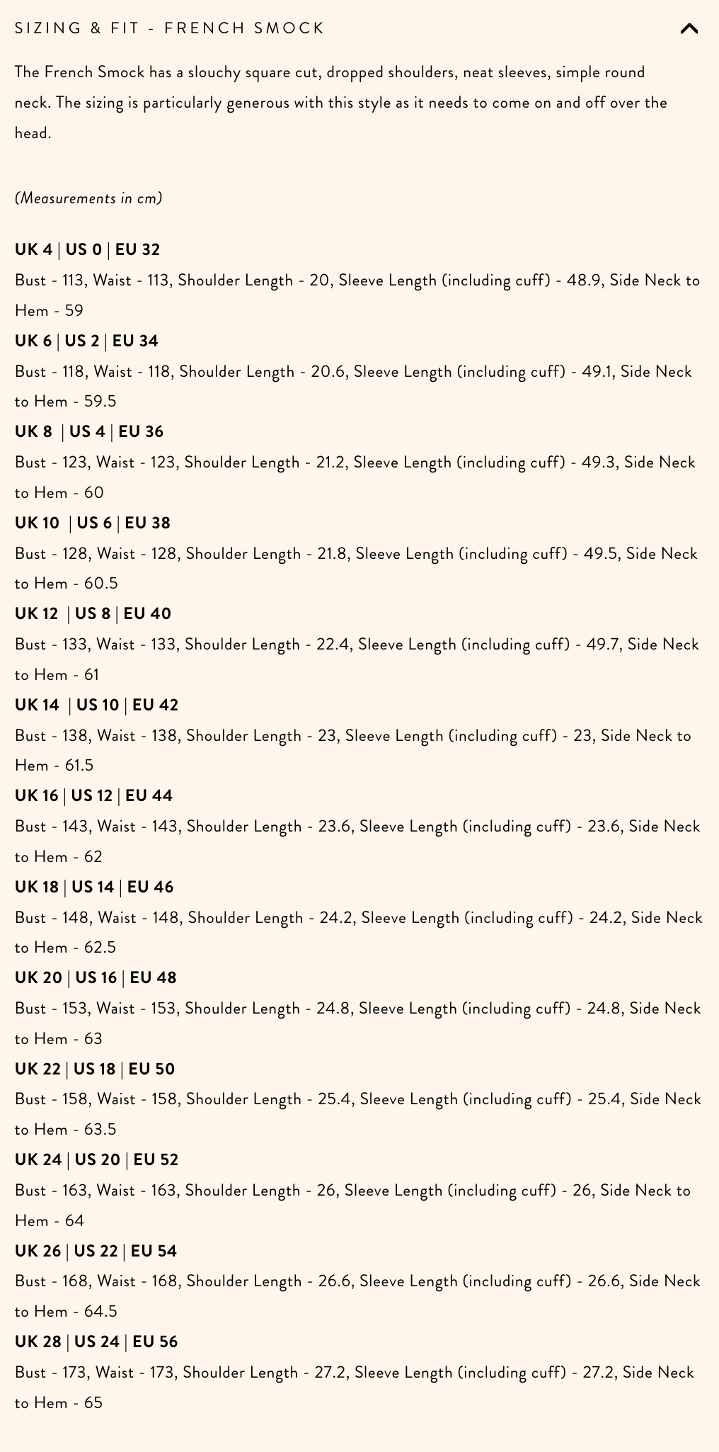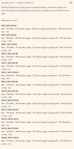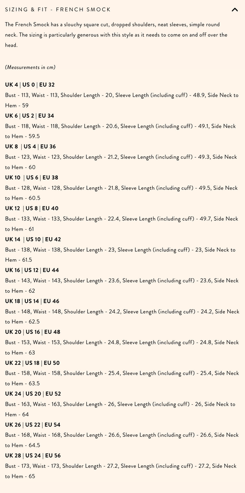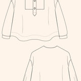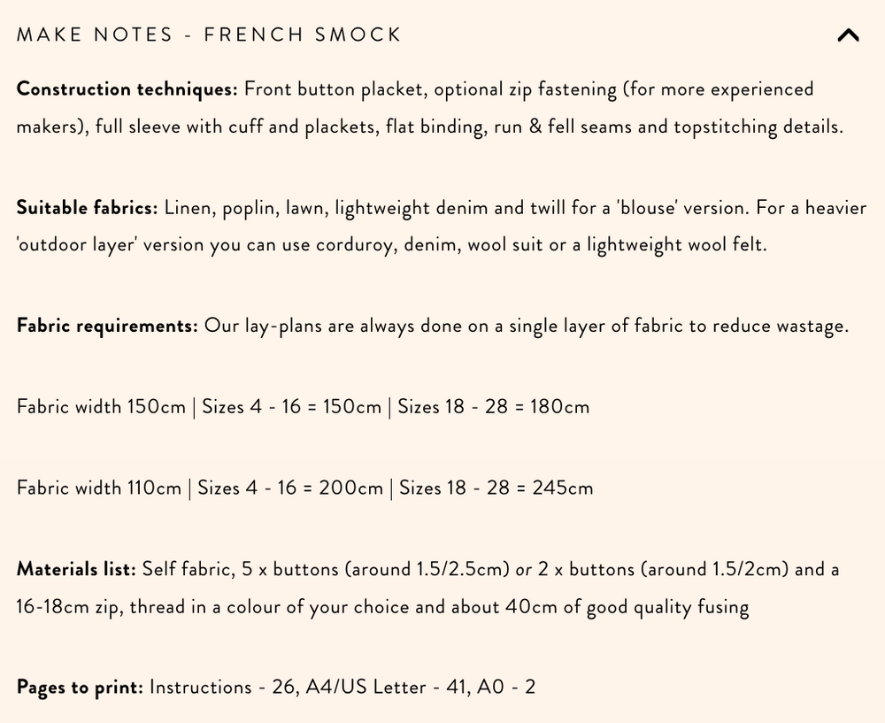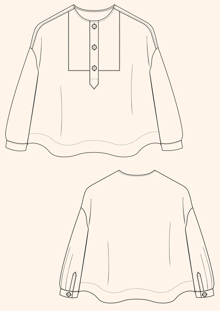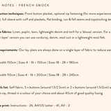 The French Smock is a casual classic that comes with a huge range of design options which include: a button up placket OR zip fastening, different bib shapes, an optional trim for the curved bib, optional patch pockets, 2 different lengths and options for thick or thin fabrics for the cuff, sleeve placket and neck binding (thin fabrics can use the smaller pattern pieces, thicker fabrics will want to use the wider pattern pieces.