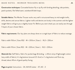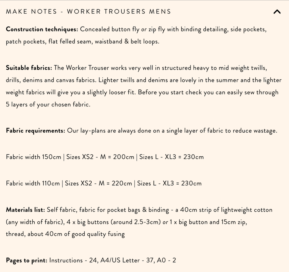 Our Worker Trousers are the ultimate everyday trouser and our best selling pattern. They are supremely practical with hundreds of you saying they're your comfiest trousers yet. Designed to stand the test of time, you'll be using high end finishing techniques to create a really long lasting pair of trousers.