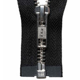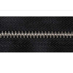 Metal mediumweight open-ended YKK zip with silver-coloured nickel-free teeth, and heavy nylon fabric tape. Suitable for items such as jackets and accessories. Choose from eleven lengths and six classic colours.