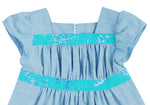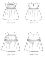 This pattern allows you to make either a sweet everyday dress and blouse, or the ultimate fancy dress and blouse. Both views feature a pretty shirred front bodice, gathered skirt, and a keyhole back-neck opening. The dress version includes cute cap sleeves while the blouse option is sleeveless, but you can mix and match to create a variety of darling styles from one pattern. This pattern is also perfect for embellishing with ribbons, embroidery, or even smocking. After successfully sewing this pattern, you will have developed the following skills: gathering, curved seam, flat-set sleeve.