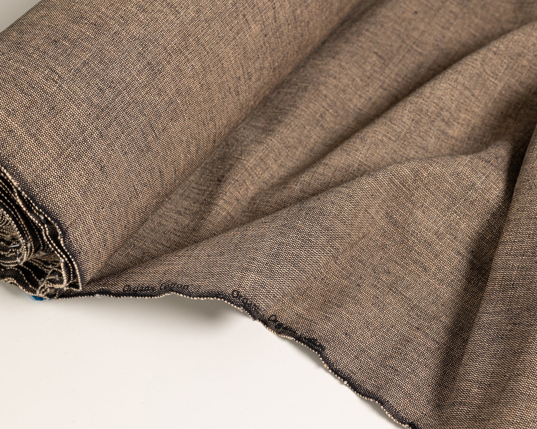 Heavyweight yarn dyed fabric handwoven in Kerala, India. Durable, hard-wearing fabric suitable for upholstery, bags, cushions and outerwear. This fabric is characterised by being woven using a different colour for the warp and for the weft creating an beautiful two-tone fabric. The raw spun weft threads give the fabric a rugged texture, though the softness of the yarn allows comfort against the skin.