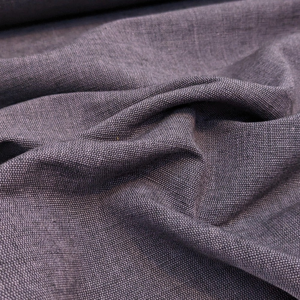 Heavyweight yarn dyed fabric handwoven in Kerala, India. Durable, hard-wearing fabric suitable for upholstery, bags, cushions and outerwear. This fabric is characterised by being woven using a different colour for the warp and for the weft creating an beautiful two-tone fabric. The raw spun weft threads give the fabric a rugged texture, though the softness of the yarn allows comfort against the skin.