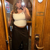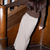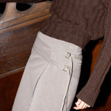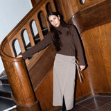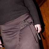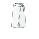 The BUCKLE Skirt is a long low-waisted wrap skirt with two buckles at the front side. The skirt features a wide waistband and an asymmetric front overlap. It fastens with a combination of a hidden button on one side and the two buckles on the other side. You can either use an adjustable buckle or a belt buckle. The skirt doesn’t have a lining.