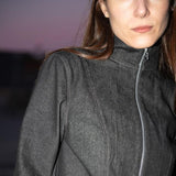 The Zip Vest with Basic Sleeves is a slightly fitted jacket with space for a sweater underneath. It has a high collar and a zipper in the front. It does not have a lining. The instructions also describe how to make the Zip Vest without sleeves.