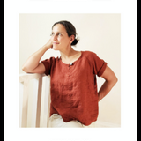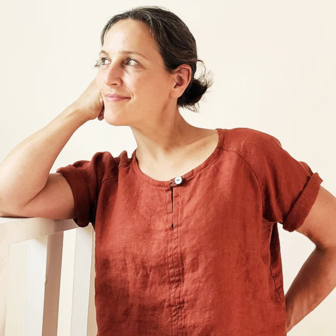 Suggested fabrics: This top was originally designed for very light weight linen. While it can work in a variety of light weight woven fabrics, this top is the perfect, simple backdrop to let a beautiful linen shine. If you choose a more rigid fabric such as cotton lawn, the neck may appear a little smaller and the bottom hem will be a bit fuller and not drape as closely to the body. Also be aware that one-sided printed fabrics will not look good once the sleeves are rolled up. Be sure that the front and back sides of your fabric are presentable.