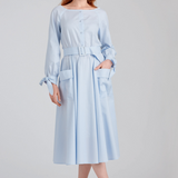 Misses' Dresses, mid-calf or knee-length. Raglan short or long sleeves have tie-cuff feature. Front button closure on bodice, semi-full skirts and buckle-fastened belts.