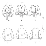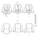 Misses Jackets in two lengths. Unlined with front fastening and pocket variations. Dropped shoulders, straight long, or cuffed sleeves. View B has blanket-stitch feature edging. All styles have soft belt.