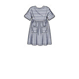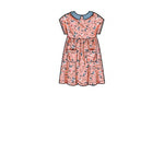 Children's and girls' knee-length dresses and top have round neck, all-in-one sleeves, elbow or short length; pocket and collar details; knit leggings.