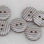 15mm striped polyester two-hole buttons. Shiny surface with slightly rounded top but flat back. These are perfect for larger-placket shirts, knitwear, children's clothes, crafts, cushions... Machine washable.