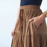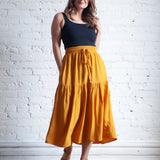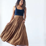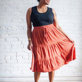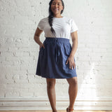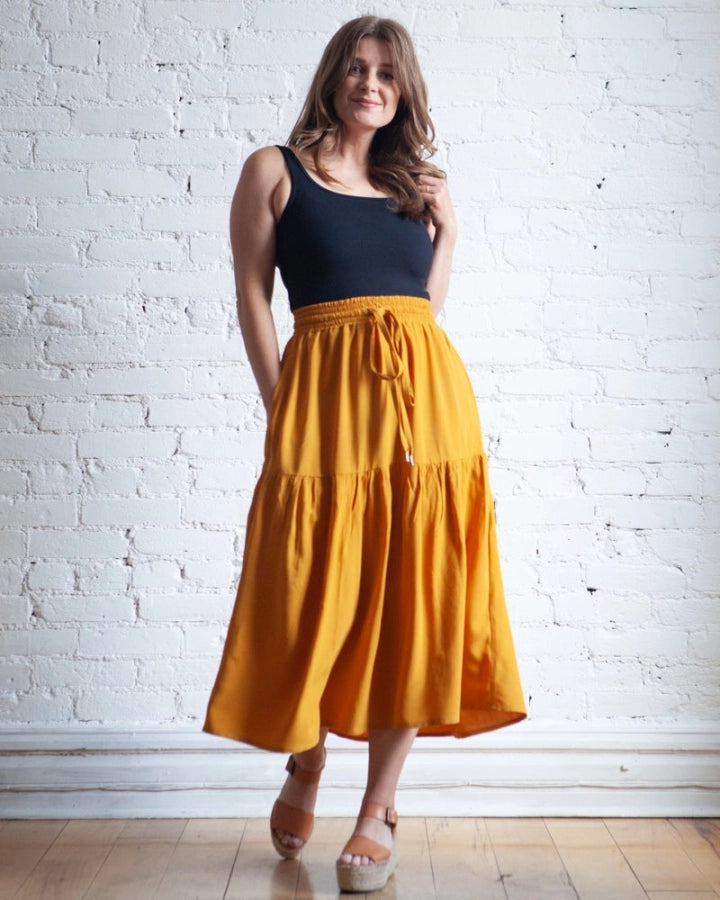 The Mave pattern is an elastic waist skirt with a drawstring, inseam pockets and an optional lining. The skirt can be made with or without ruffles in different lengths to create numerous options.