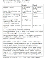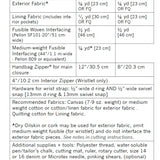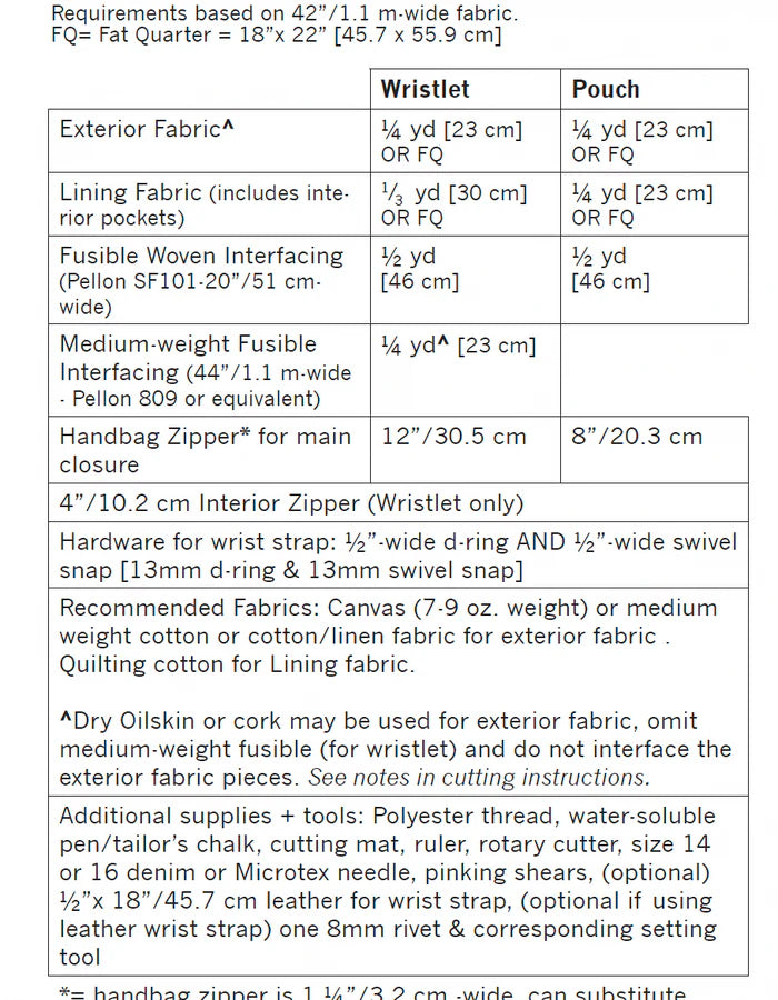 ^Dry Oilskin or cork may be used for exterior fabric, omit medium-weight fusible (for wristlet) and do not interface the exterior fabric pieces. See notes in cutting instructions.